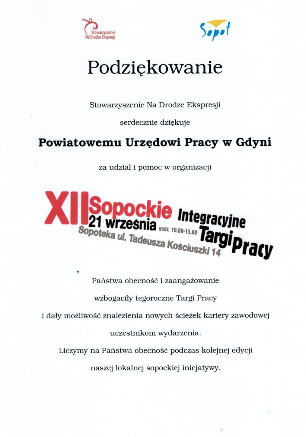 Stowarzyszenia Na Drodze Ekspresji za udział i pomoc w organizacji XIII Sopockiej Integracyjnej Giełdzie Pracy