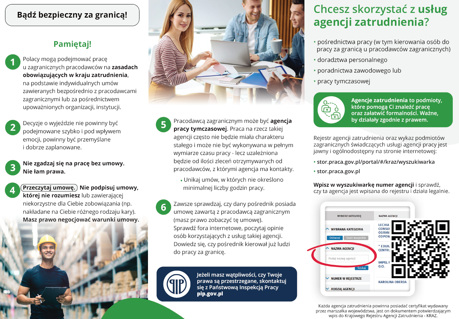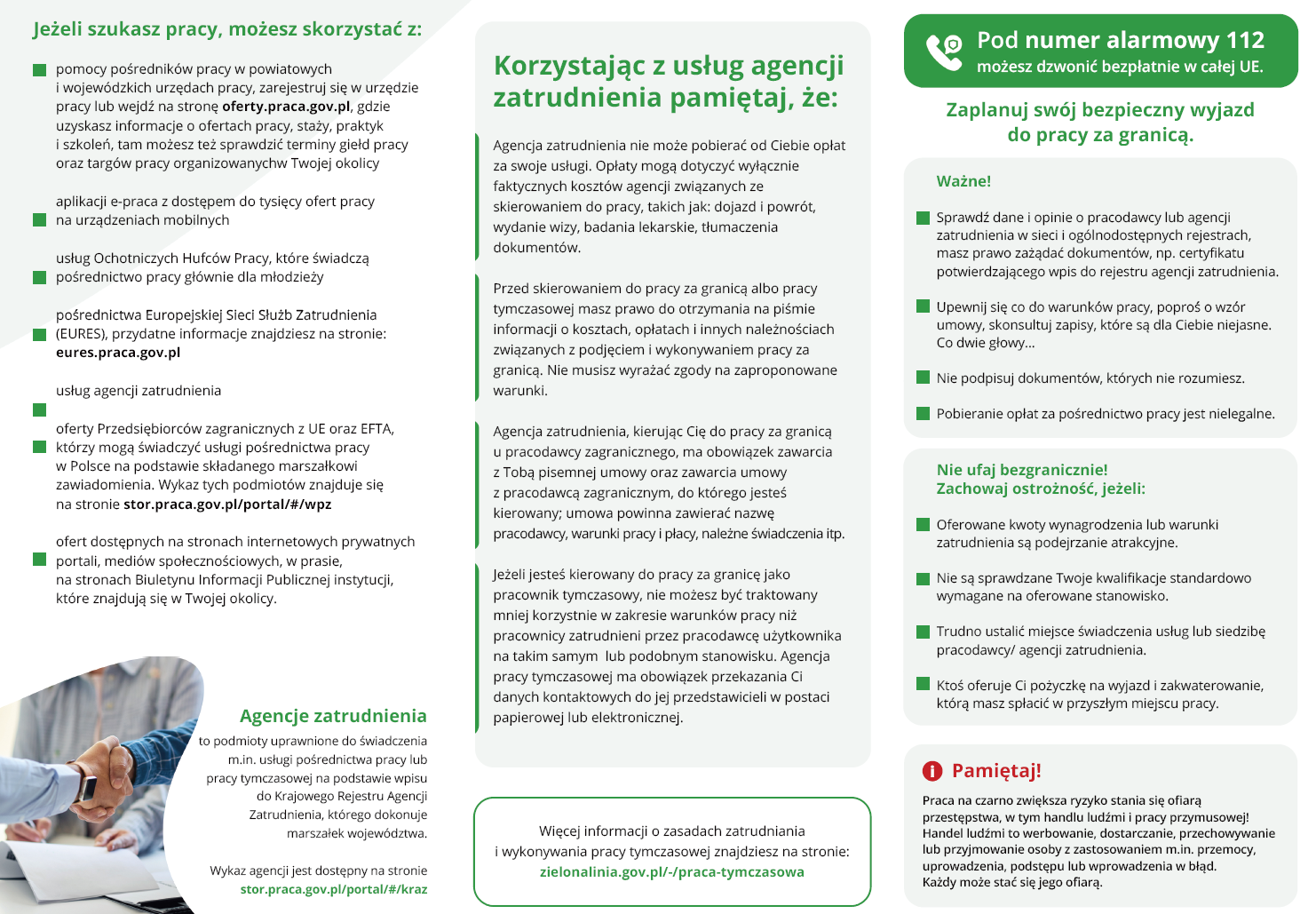 W zakresie rynku pracy uwzględniono statystyki, analizy, informacje o pracodawcach, agencjach zatrudnienia oraz spółdzielniach socjalnych. Przedstawiono metody poszukiwania pracy, w tym za pośrednictwem sieci EURES, oraz zasady legalnego zatrudniania cudzoziemców i warunki życia i pracy w Polsce. Omówiono również kwestie pracy sezonowej za granicą oraz prawa pracowników delegowanych.